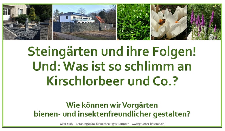 Die Folien zu ihrem Kurzvortrag sind unter diesem Link abrufbar: https://www.nachhaltig-gaertnern.de/aktuelles. Wer noch weiteren Anschauungsunterricht braucht, kann sich die Facebook-Seite "Gärten des Grauens" zu Gemüte führen.