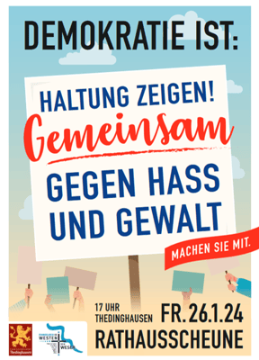 Zu der Kundgebung HALTUNG ZEIGEN! GEMEINSAM GEGEN HASS UND GEWALT kamen am 26.01.2024, auf Einladung der Kirchengemeinden und unserer SG Bürgermeisterin rund 200 Menschen jeden Alters zusammen. Auf dem Foto oben ist Harald Hemmje zu sehen, der für unsere Fraktionen sprach. Alle Fraktionen waren aufgerufen 3 gute Gründe für unsere Demokratie auszusprechen.